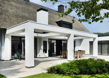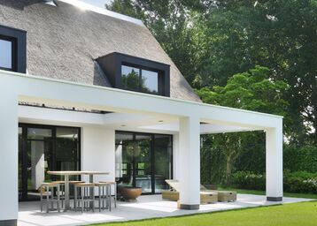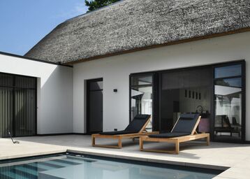 Voor dit project verzorgde Alumiant de aluminium kozijnen van een karakteristieke woning met witte gevel en rieten kap. De strakke zwarte kozijnen en deuren vormen een opvallend contrast en benadrukken het moderne karakter van het huis, terwijl het klassieke rieten dak de woning warmte en charme geeft.