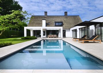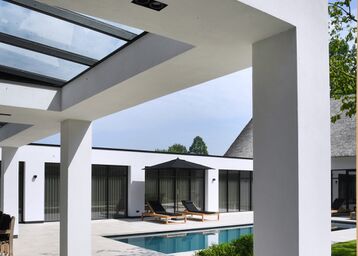 Een van de blikvangers van het project is de meterslange ramenpartij langs het zwembad. Dankzij deze royale glaspartij valt er volop daglicht naar binnen en ontstaat een sterke verbinding tussen de leefruimtes en de tuin. De schuifpuien en openslaande deuren openen de woning naar het terras, waardoor binnen en buiten moeiteloos in elkaar overlopen.