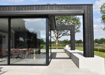 De grote schuifpui opent de leefruimte naar het terras en de tuin, waardoor binnen en buiten bijna naadloos in elkaar overlopen. Het paviljoen in de tuin is eveneens voorzien van aluminium deuren en kozijnen in dezelfde zwarte afwerking, waardoor het geheel één harmonieus en modern geheel vormt.