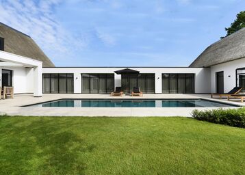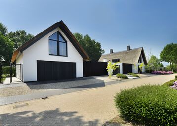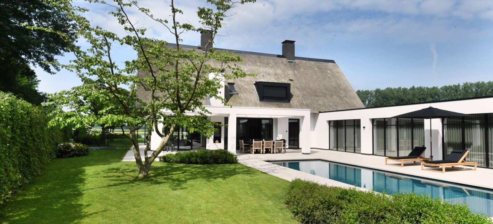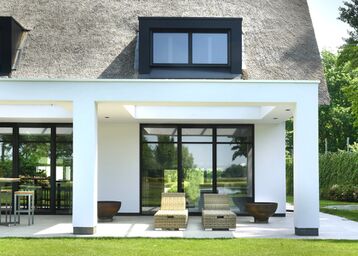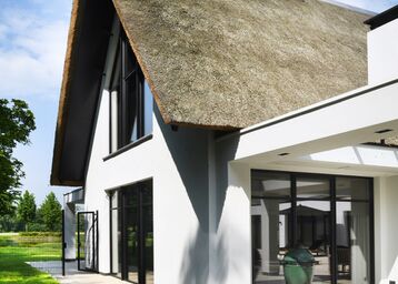 Voor dit project verzorgde Alumiant de aluminium kozijnen van een karakteristieke woning met witte gevel en rieten kap. De strakke zwarte kozijnen en deuren vormen een opvallend contrast en benadrukken het moderne karakter van het huis, terwijl het klassieke rieten dak de woning warmte en charme geeft.