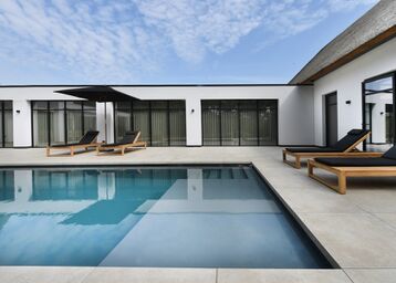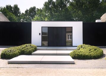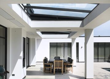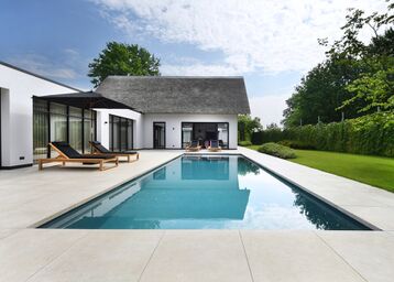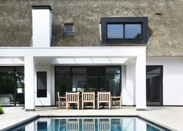 Een van de blikvangers van het project is de meterslange ramenpartij langs het zwembad. Dankzij deze royale glaspartij valt er volop daglicht naar binnen en ontstaat een sterke verbinding tussen de leefruimtes en de tuin. De schuifpuien en openslaande deuren openen de woning naar het terras, waardoor binnen en buiten moeiteloos in elkaar overlopen.