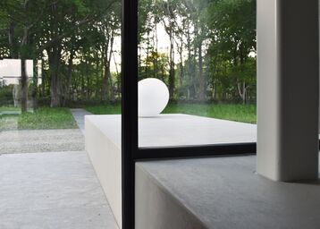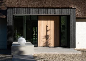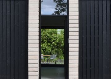 De grote schuifpui opent de leefruimte naar het terras en de tuin, waardoor binnen en buiten bijna naadloos in elkaar overlopen. Het paviljoen in de tuin is eveneens voorzien van aluminium deuren en kozijnen in dezelfde zwarte afwerking, waardoor het geheel één harmonieus en modern geheel vormt.
